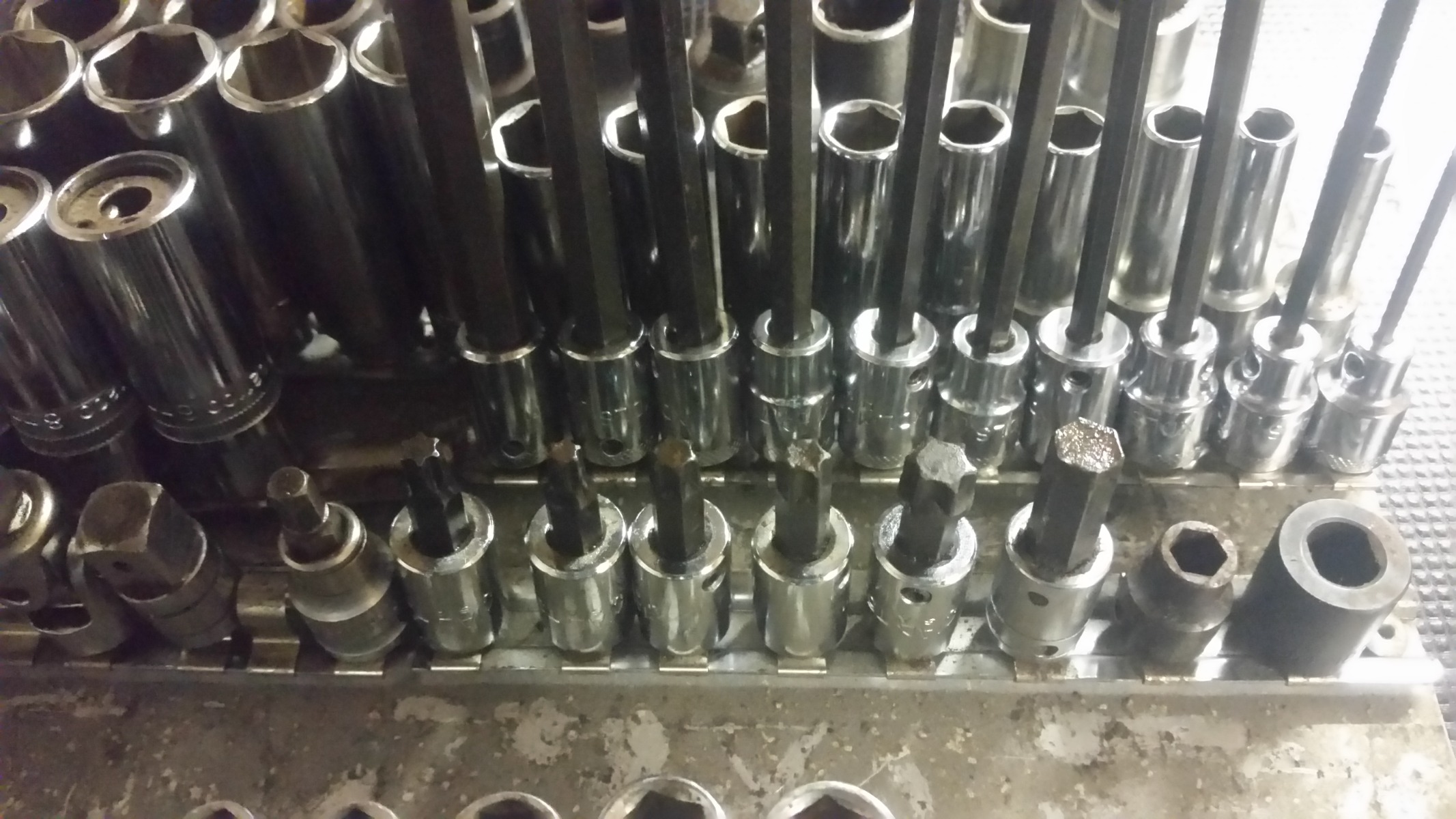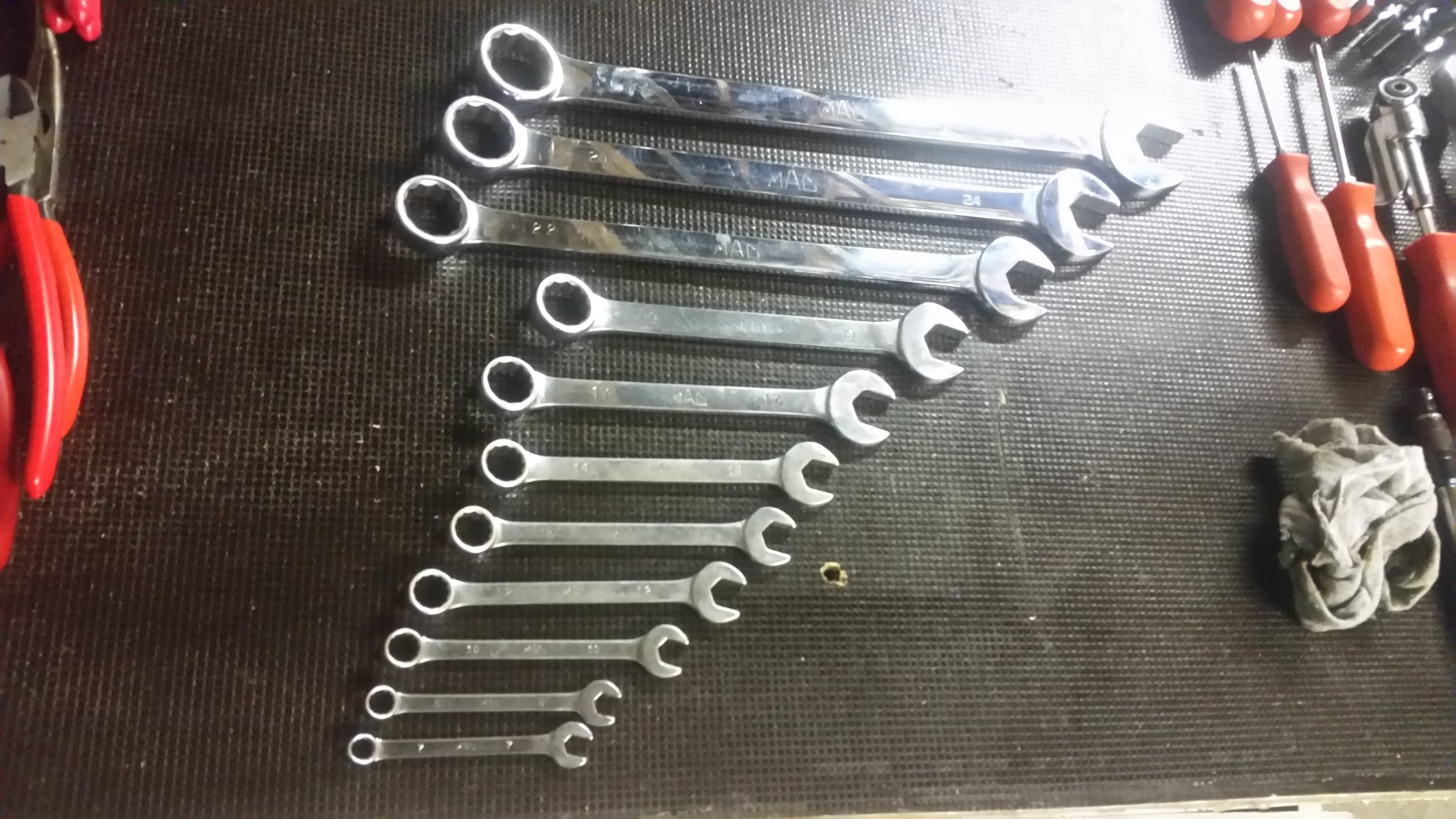 it's all part of a bereavement sale, my friend dougie sadly died age 83 in April, he was a gifted mechanic and a kawasaki man from 1971, he worked for kawasaki until 1984 then set up his own business as a kawasaki specialist in 1984 through to 2010, I really miss him and I'm trying to buy all the tools I can to preserve them and look after them the way that he did, he was a big fan of mac tools, I'd say I've bought 20% of his workshop so far. ..there's only so much I can afford at one time! I organized and polished up a lot of these tools yesterday, here they are....!