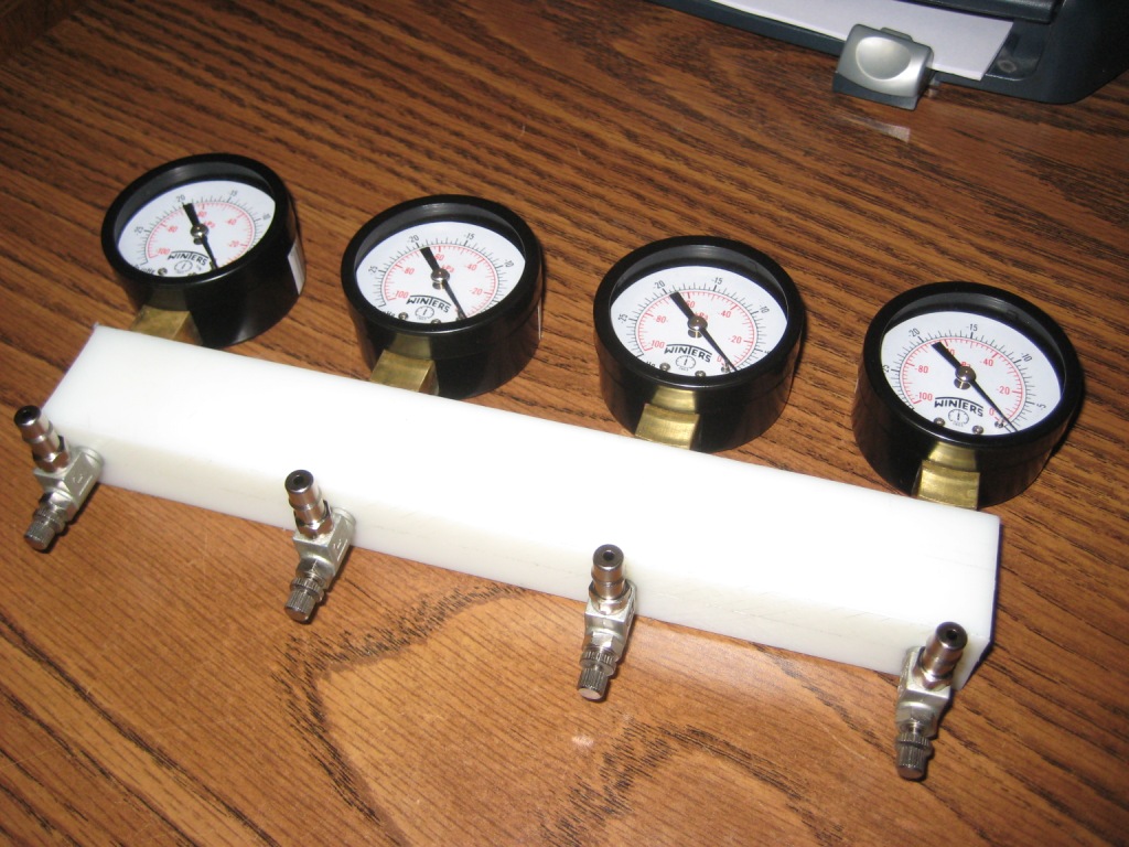 When I was drilling the holes in the acetal plastic I screwed one up and it got oversized (smallest hole) so one gauge bounces erratically even if the flow knob is dialed right down (SMC flow controls)