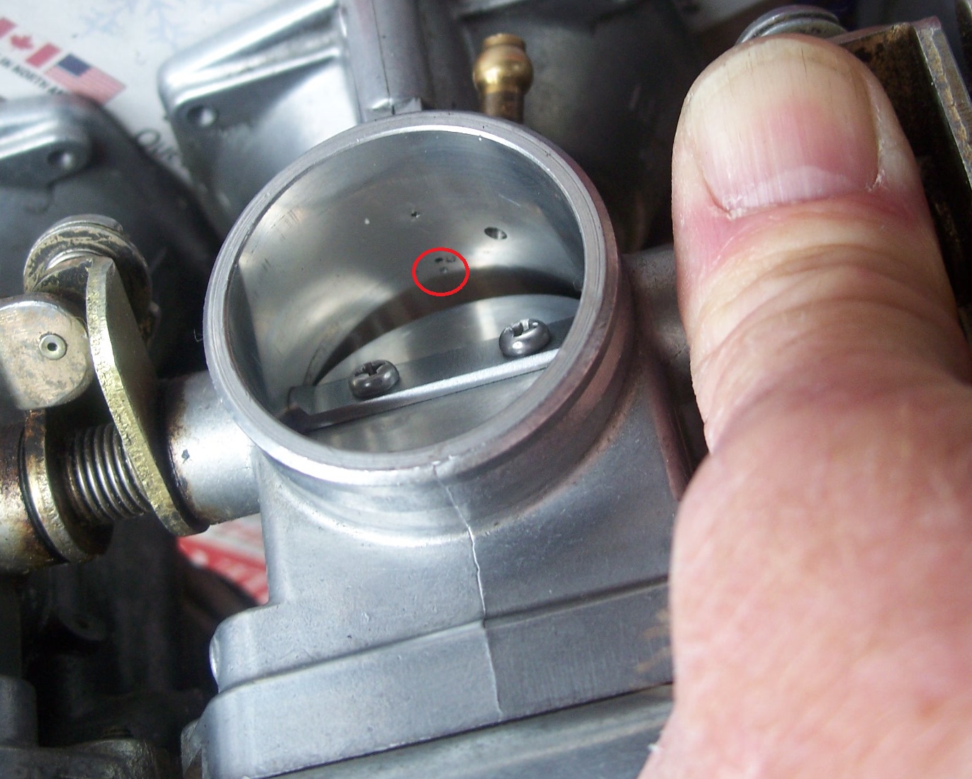 Open the throttle butterfly (engine side of carb), look in and up. Can you see anything resembling the 3 tiny holes circled in the pic below? If so then these are pilot bypass holes and should be clear, Carb cleaner sprayed in the pilot jet should also come out here. They clog easily with dried gas residue etc