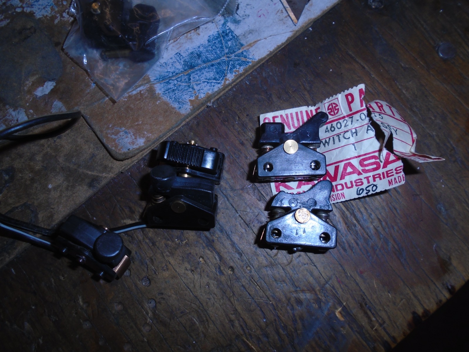 Cool story about Your original Z650 Warren!! Your pic of the switch is a tiny thumb and i can't make it any bigger but i can note the existence of a hump on the "Horn-(Pass)" toggle bar. Your Euro version had a SPDT switch and while part number didn't change the plastic toggle bar did, more pronounced "hook" for pass in superseded bar 46027-015. This resulted in an extra wire within the wiring harness for city light. US models used a simple SPST and came in two versions. Photo of the 4 different style switches used from 1976 to 1980. And a couple finished tops. Kim.. i have a couple boxes of these assorted switches, let me check before you buy one! Now that Warren sorted me out, Thank-You Warren!! I know what to look for now.