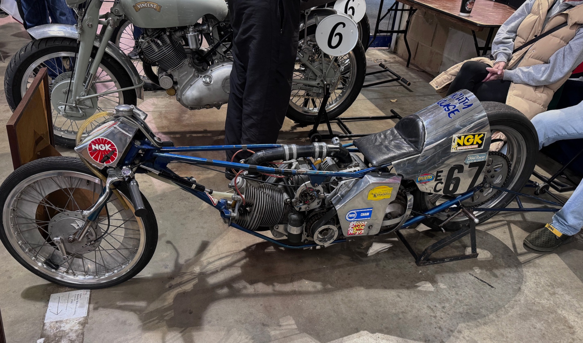 Here's an impressive 60s blown fuel 500cc Vincent, built and still owned by Brian Chapman in our Vincent club. I think his best et was a 8.25 @ 169 mph.