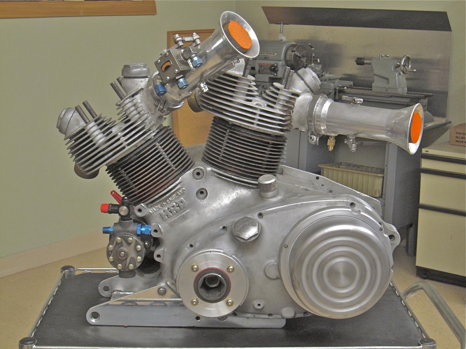 I've been working on this old Vincent drag bike for a few years now. The first photo is as I found it. The second photo is from the 60s. The third photo shows the bike at a land speed event in California in the late 70s. A hard life on nitro caused a lot of damage to the crankcases as well as the heads and required lots of welding and machining. The motor still needs special valve made as well as a custom oil pump. I'll get back on the chassis after the motor is finished.