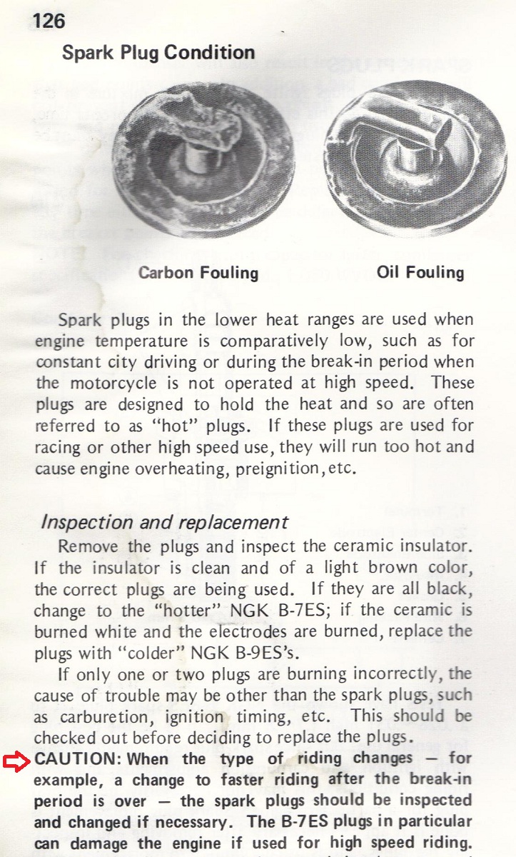 Enhanced engine performance may sometimes benefit from a colder running "9" spark plug (NGKB9ES) in racing or extended high speed applications.