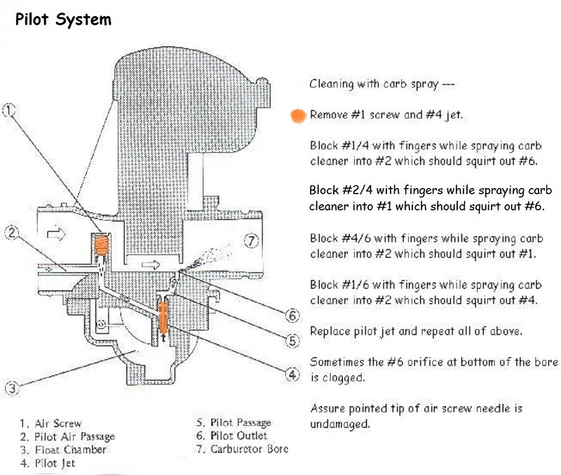 The basic idea is to clear all the pilot circuit passages to achieve a correct fuel mixture entering the bore through the orifice in the bottom of the bore.