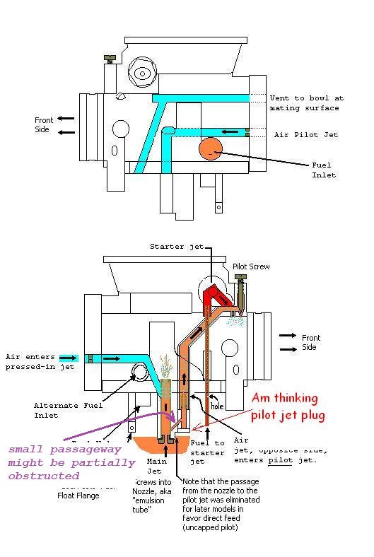 Excellent Diagram. I'll give it shot on monday my day off! The bike ran before I rebuilt the carbs. This is why I'm worried that Soaking them in Berrymans may have some how effected them. When I sprayed down from the enrichmnet chamber I noticed if I didn't get the straw directly in the hole of the enrichment circuit to the enrichmnet tube, fluid would come out around the enrichment tube and not through it.This also makes me wonder if Berrymans somehow dissolved sealant where the brass post is pressed fit into the carb base from manufacture. Possible? When I pull off the carbs I think I will try to plug off both end of each Carb and look to see if the butterfly shafts are leaking. I have cleaned the Enrichment circuit countless times, and spray always comes out where it is supposed too. I know the enrichment circuit helps to start the bike, does the pilot only kick in once started. I took the top off of number 1 carb and turned over the engine and I could see the pilot spraying.(I believe this is only because the diaphragm and needle were removed) So if the enrichment circuit does not start the bike, then there is not enough vacuum to raise the needle just enough for the pilot to kick in) . By removing the needle I allowed the pilot jet fuel and the engine suction did the rest. Am I on the right Track?