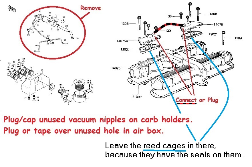 For the dog system just remove the tank, remove the smog system. The long hose can be measured and cut to fit across both front ports to connect them using the original spring clamps. Then you must plug or cap the small ports on the carb boots where the small vacuum lines were. Then tape or cover the hole in the air box. I would add pic but I can't figure out how on my ipad.