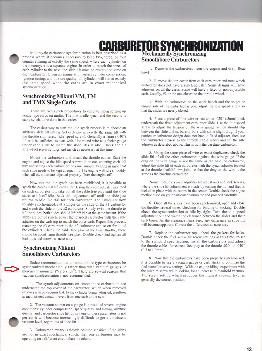 I'm as yet unconvinced why smoothbores should only be bench synced without the same later running sync used on stock Mikuni's as provided in the FSM. And I have long enjoyed success in syncing smoothbores by following the FSM stock carb sync procedure for Mikuni mechanical throttle slide carbs. The dreaded "air leaks" with caps removed hasn't been an issue. And in any event, running sync may be easily verified by reading the manometer or vacuum gauges after the caps are replaced and vacuum plugs reinstalled.