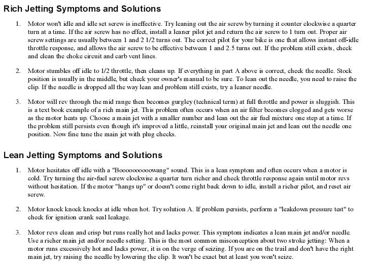 For mixtures, set the idle higher than normal. Turn the screws in or out to get the highest rpm. If they're more than two turns out from seated you'll need larger slow/pilot jets. Alternatively use a colortune if you can get your hands on one.