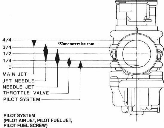 After you get the pilots set you can work on the mains and lastly the needles. You can do this by marking 0, 1/4, 1/2. 3/4, and full throttle with tape on your throttle and doing throttle chops at each setting. Adjust the proper jet system based on the photo showing systems vs throttle position.