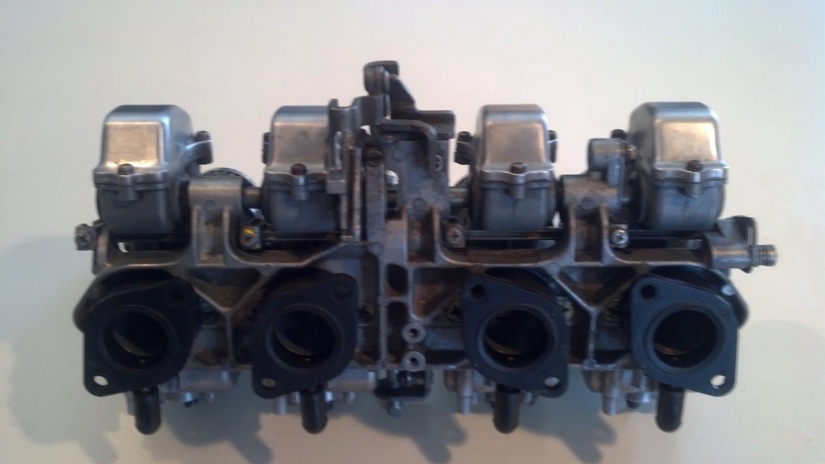 Hi all, finally getting around to selling off some cycle stuff left over from my 1980 Classic that was sold couple years back. I had bought this set of carbs a few years ago to replace the fuel injection on the Classic. The F.I. never really failed me so these carbs sat on my computer desk until now. I changed the jetting to hopefully be close to the kz1000 specs and at least wrote down the jet size and the pilot jet sizes (120 main, 20 jet) but cant remember if I changed the needle position. I believe I bought these as vm28 carbs and the measurement in pic below confirms the intake bore to be just over 28mm. it has single fuel inlet, 3 of the 4 carbs have what I'm guessing to be vent nipples, and diagonal drains on bottom of float covers. Unfortunately no big hex drain bolt. LOL all carbs have the marking 110 over 9 on motor side flange (see pic). Sorry for the long-winded post but I want to know what I really have for sale.