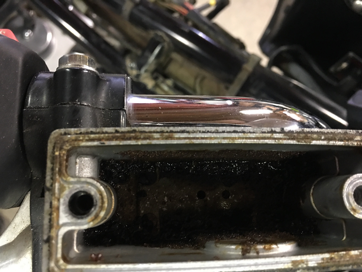 After much pounding, hammering, and chiseling I got the top of the master cylinder reservoir off. No front brakes, and when I first looked in the sight glass, was not encouraged by the fact that there was a 'level' that did not move when you moved the bars