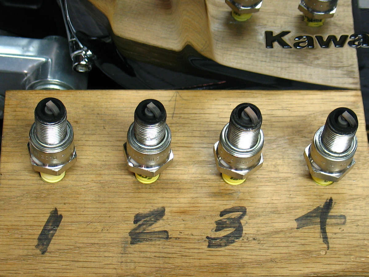 This is what the spark plugs look like with all four PILOT FUEL SCREWS just under 1/2 out from lightly seated.