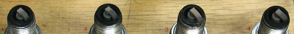 Looks like the electrode on 3 indicates a leaner burn and the base ring has a spattered-black appearance, when compared with the other plugs. Ideal would have them all the same...