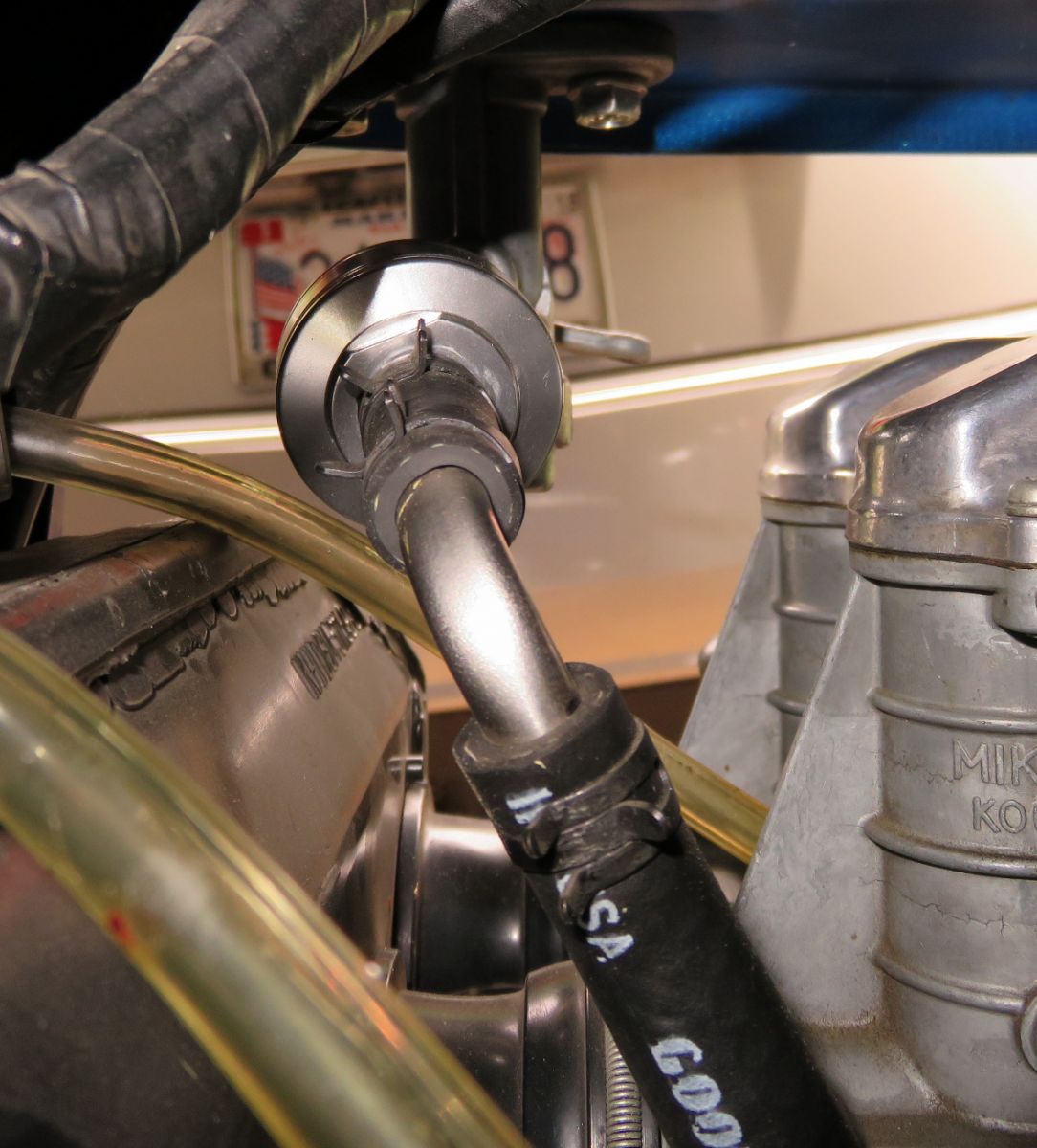 The fuel level is set too high. This condition occurs when someone has bent the float tang as mentioned above. This condition can be checked using what is referred to as the "clear tube test." The test involves attaching one end of a clear piece of flexible tubing to the carb drain hole and holding the other end of the tube above the bowl/carb joint. When the fuel is turned on it should rise in the tube to a level 2.5 - 4.5 mm below the bowl/carb joint. If the fuel rises higher than that level it may run into the cylinders or over the upper end of the brass overflow inside the carb bowl (mentioned above) in which case it will run out the overflow hose. This condition is corrected by removing the float and gently bending the tang to raise the float valve needle position. Doing this may take several tries before achieving the desired fuel level.
