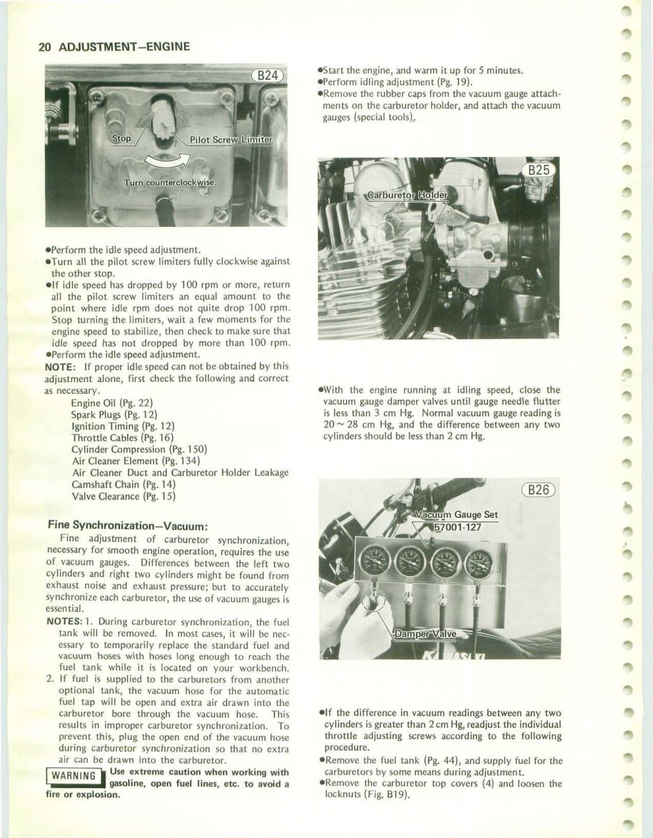 When doing the bench sync, be sure to allow sufficient thread length on the throttle stop screw to permit further lowering of the throttle slides during the running sync, as it may otherwise be impossible to sufficiently lower the rpm to the desired idle.