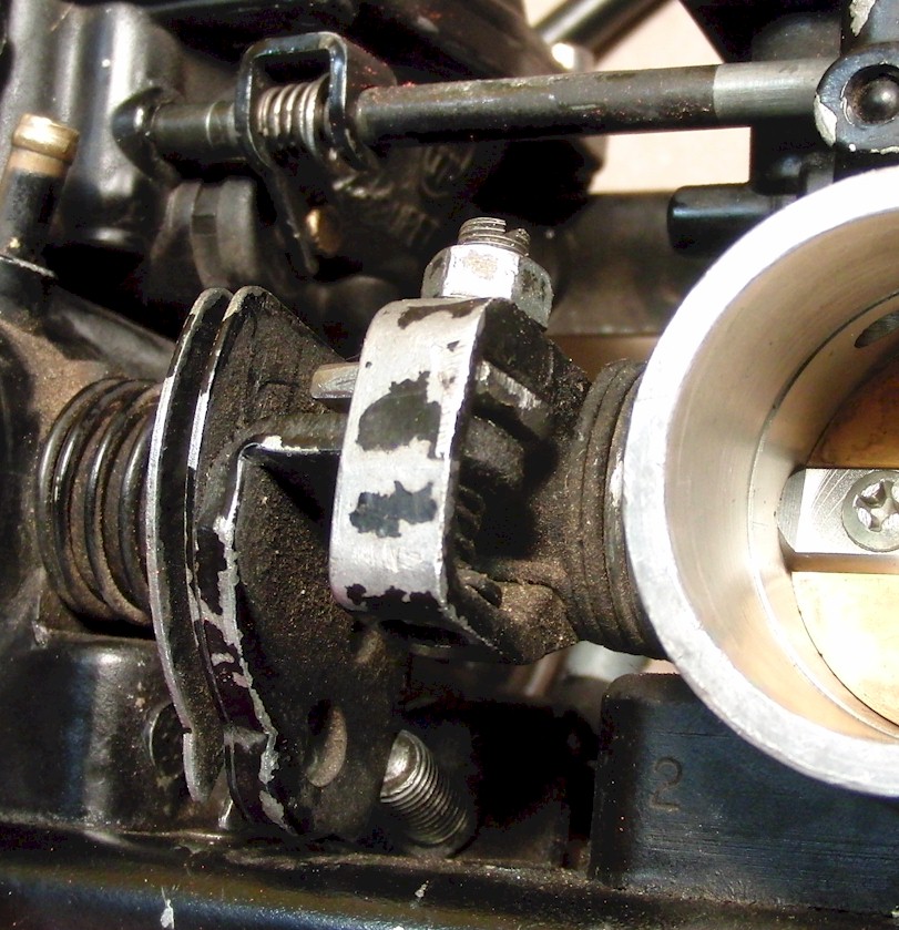 Note, to anyone interested, this is the repair to the sync linkage. It's M5 x .5 thread (metric fine). The excess of the plate on the right side, as seen in the photo, had to be cut off so it not interfere with the intake manifold when the throttle moved. This photo was taken before it was cut and installed on the bike. The bell-crank coming in from the left pushes up on the bottom of the set screw, so it holds the threaded plate up against the linkage. The plate is wide enough so it won't spin. So it adjusts the same as it would have come from the factory.