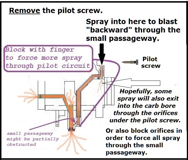 In each CV carb, regardless of exact model, there are probably several paths whereby carb cleaner may be force sprayed through the various sections of the pilot circuit.