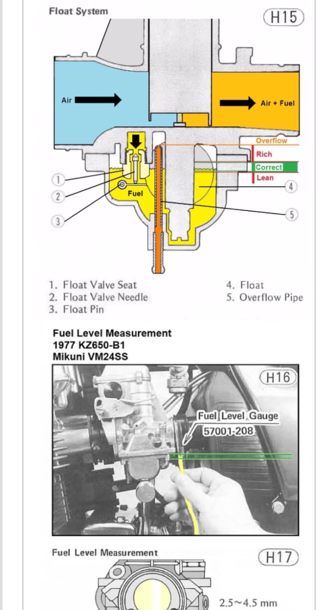 +1. . I didn't want to mangle the floats, so instead of bending them, I flexed each tang x number of times. Flex, flex, flex with an appropriate tool, reinstall & check the fuel level. Then do it again. I spent a couple of hours & got all four to exactly 3.0mm below the carburetor body. To speed up the process you don't have to use all 4 float bowl screws per carb each time >> I used 2 per carb, some guys only use 1 screw per float bowl. Also, I rigged up a simple float support so the tangs were easy to flex, and like gordone I also made a carb stand >> 2x4s w 2x6 base & a couple of angle iron L-brackets plus a bungee cord.