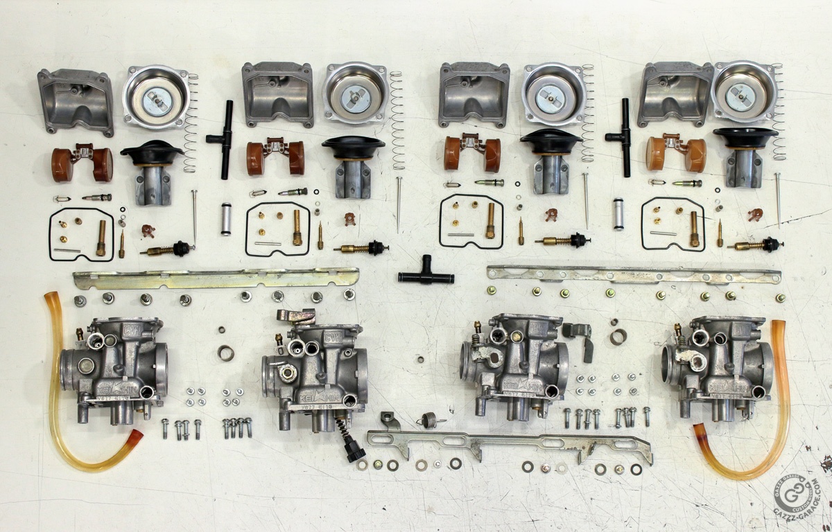 Got my carbs back yesterday from a partial disassembly and cleaning. Wanted to give them a good cleaning on the outside before I put them back on the motor. As I stated, don't do this at home unless you are single or plan on becoming single. This is a rack of Mikuni 33mm smooth-bores that have been taper-bored to 37mm, work done back in the 1980's.