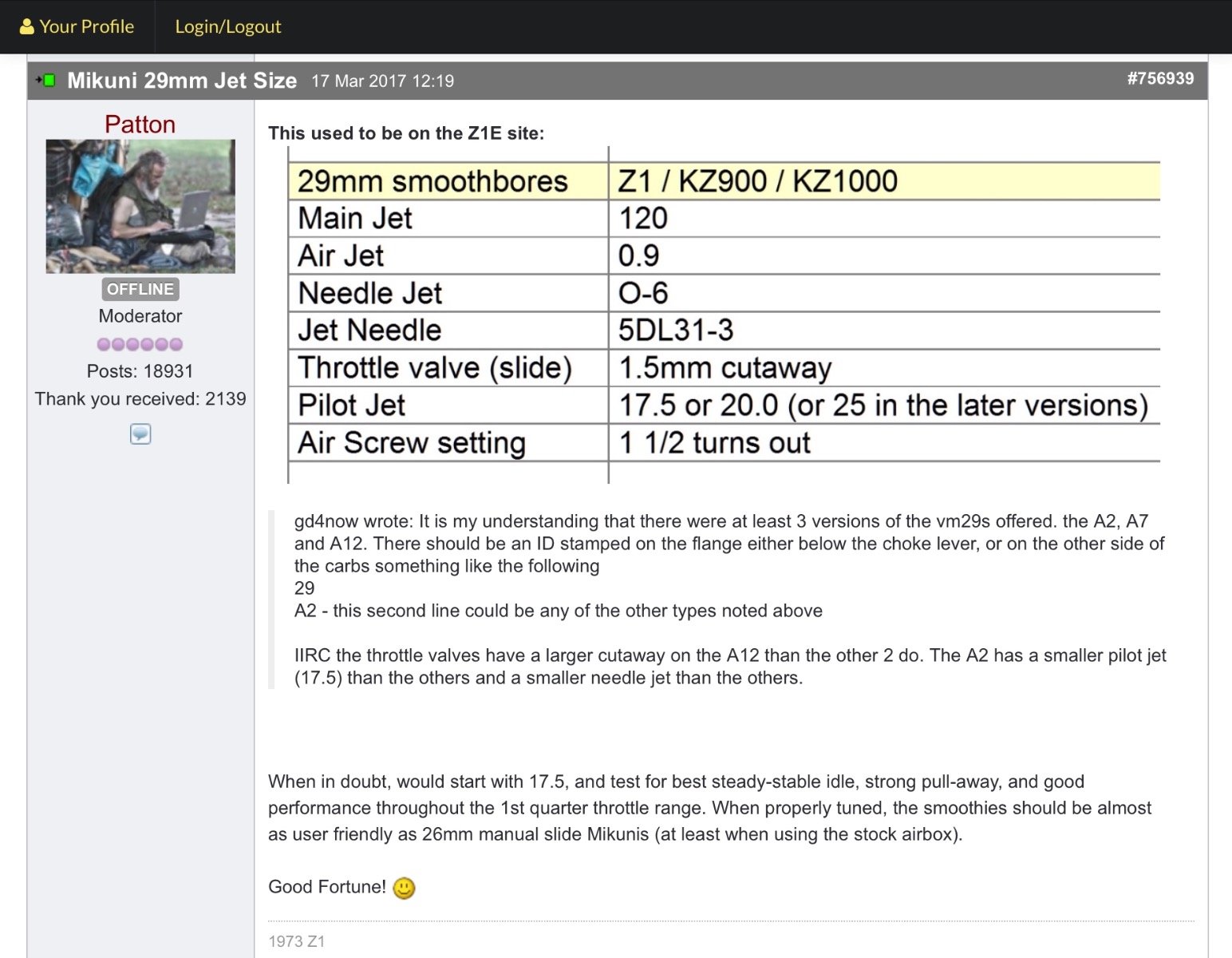 I have a 1977 kz1000 LTD. It has the 1100 kit on it with heavy duty valve springs. Dyna ignition and coils. It has a stock airbox and the stock exhaust with some of the baffles removed. I am looking to put a set of 29mm mikuni carbs on it. My question is, what should my pilot and main jet size be? And what should the air screws be set at? Any information will be greatly appreciated.