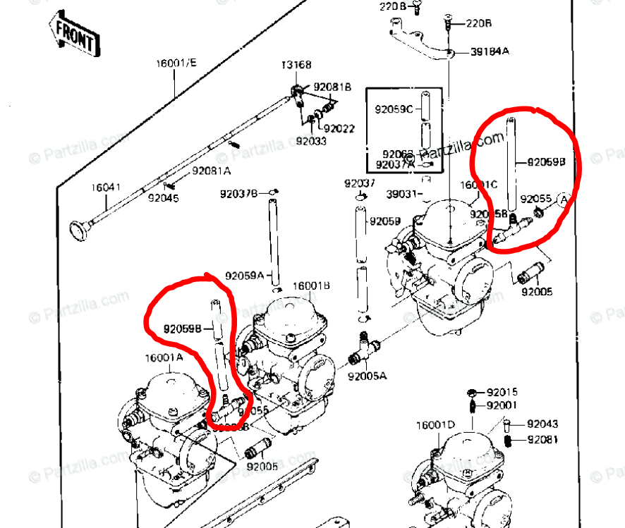 Can anyone tell me if the tubes between carbs 1 and 2, and carbs 3 and 4 are supposed to be one tube? Or are they supposed to be running somewhere else.. There was nothing connected to them when I bought the bike and it had a vacuum leak. I suspected it was from those ports so I put a tube on them and there was no more vacuum leak, ran great. But now fuel is now leaking from all 4 carbs into the air box. Any suggestions? Attached is a blueprint of the carbs and a photo of the tube I put on.