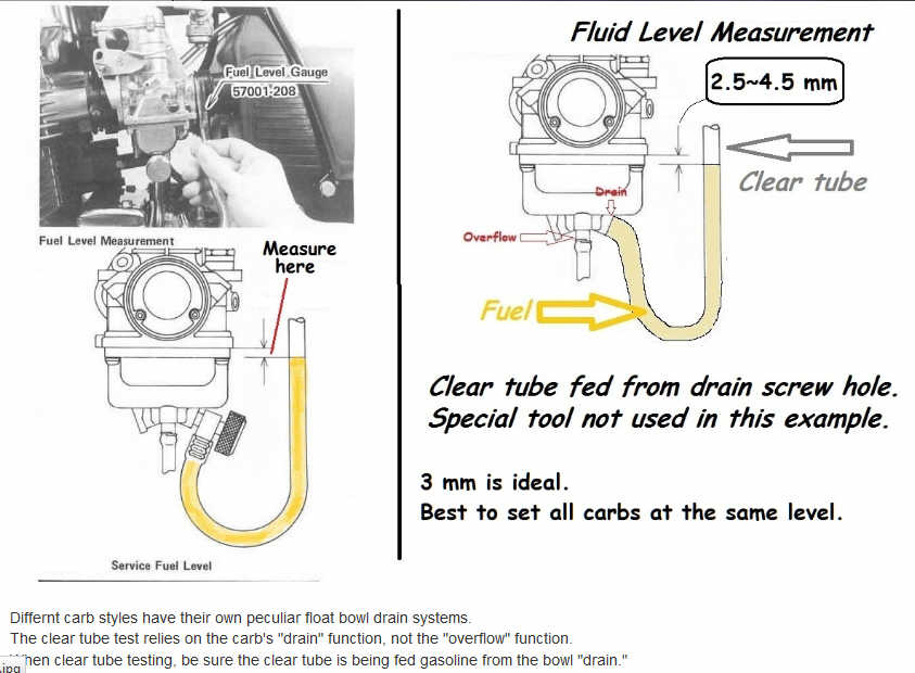 Fuzz0912: I am not familiar with your specific bike, but the clear tube method is taking a clear tube (duh) and screwing it into the float bowl drain screw. Add gas to that carb and by holding the clear flexible tube next to the float bowl you will see where the fuel level is in the bowl. If you have a service manual this process should be detailed in it. Not as easy as it may sound especially when you have to keep taking the bowl off to readjust the level, but it's the only game in town for this unless you have a clear float bowl laying around. Others with your type of bike may chime in. Oh, and be careful with the gasoline when doing this.