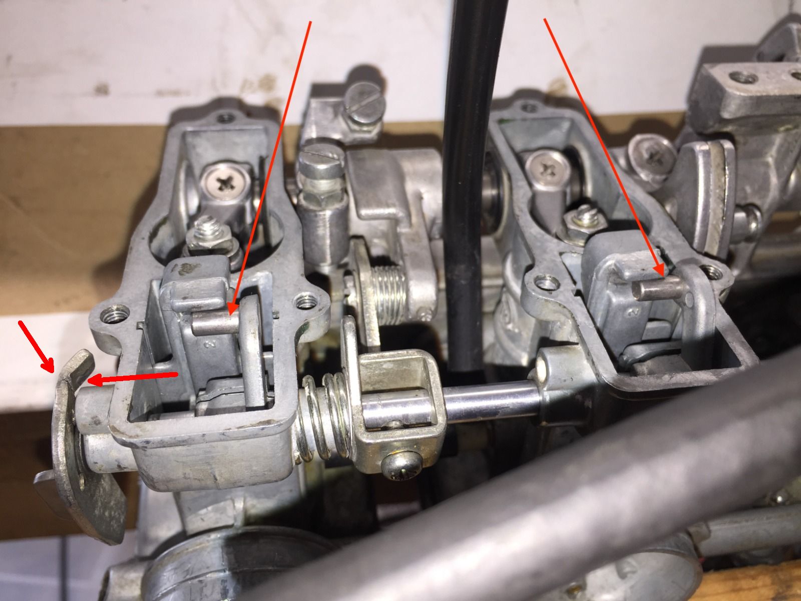 I finally got around to pulling the carbs off the bike. The air hose was fine...no blockage. But I found something interesting. All four of the choke valves had slipped out of the slot holding them. The choke lever is over-rotating past vertical, and this is what allows the choke valves to slip out.