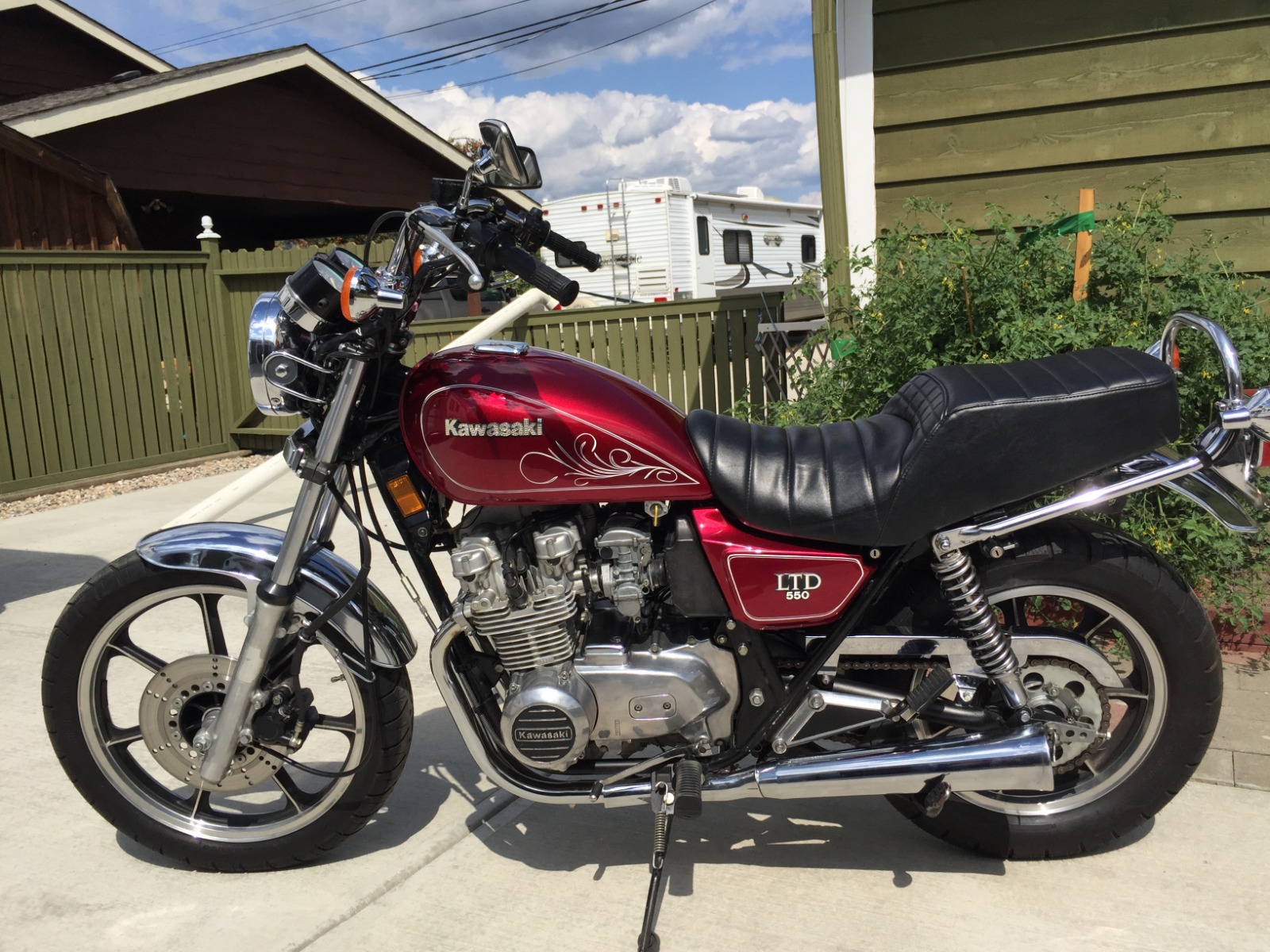 Just to finish this off....I finished installing everything and checked the carb boots for any air leaks. There were a couple so I waited til the bike was hot and tightened until I couldn't any more. Still a small leak on #2 carb but not a lot, so I vacuum synched the carbs. They were close from the mech synch...I only had to adjust one a half turn or so. The bike isn't insured this year but I took it out for a around the block to see how it runs. It's rough to warm up, as usual, but once warmed up it's very stable. It responds well to throttle, but I need to adjust the cables a bit. The throttle seems to stick at a high idle, revving about 3000 when coming to a stop, until it is twisted back to idle position. The KZ 550 is a very nice bike for a smaller rider but it's a bit too small for me, as you can see from the photo.