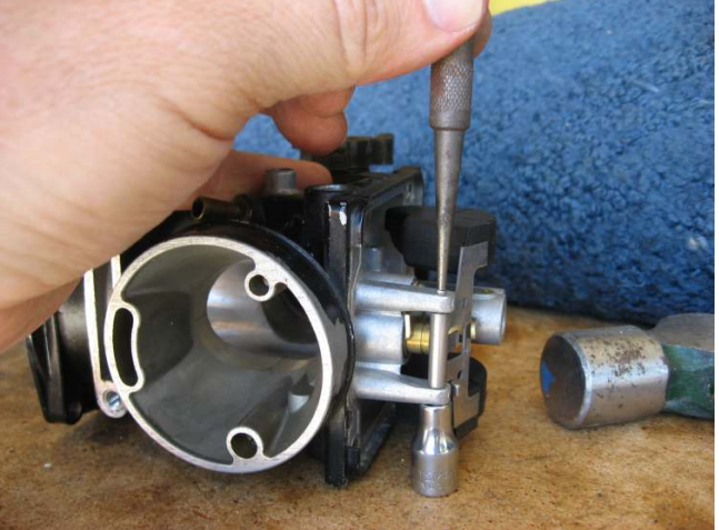 In the carb rebuild tutorial I linked it shows this photo on a specific method of removing a float pin for BS Mikuni carbs. I was hoping you would read this and apply a variation of this method to remove the pin on your carb. You may need to fabricate a support fixture that fits between the two posts so the upper post doesn't collapse when the pin is driven out. We can't tell you how to rebuild a carb we have never seen before but as you can easily learn from this thread, the huge majority of members here are KZ fans that tackle these problems by finding solutions to the mechanical problem, we don't give up and slap on aftermarket parts unless all other options are exhausted.