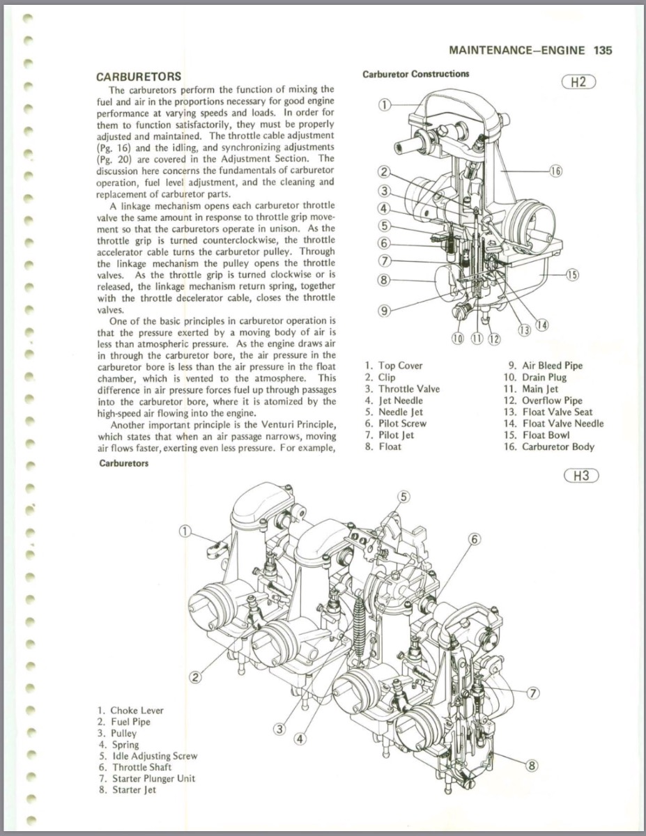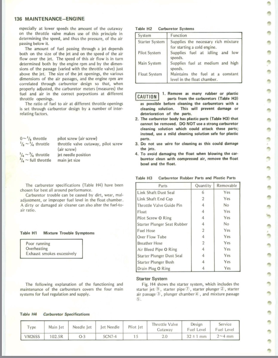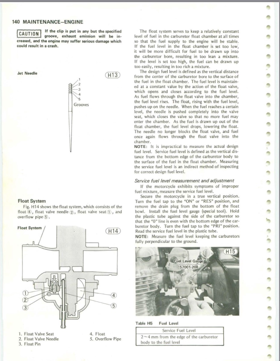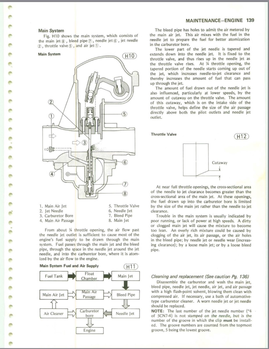 First off, thank you so much for all the informative pages! I don’t have a manual but I’ve been scraping by finding what I need here on the forums. As far as maintenance, I replaced the spark plugs, wires, and coils and have tested them again to make sure they’re all functioning good. I also set float levels to spec and check them each time I have the carbs off. Valve lash and timing is also good. The ignition is electronic but I made sure my timing advancer was operating correctly. I also sprayed some starter fluid around the carb boots to make sure I wasn’t getting any vacuum leak and There wasn’t any change in rpm level when I did that. My only thought is to maybe change the needle position and pilot jet back to how I had them with the pods since it felt like it was idling smooth with strong midrange then, but keep the main jet at a 107.5 so I don’t foul the plugs out at wide open throttle. I’m so sick of taking these carbs on and off and setting everything up just to be disappointed again!