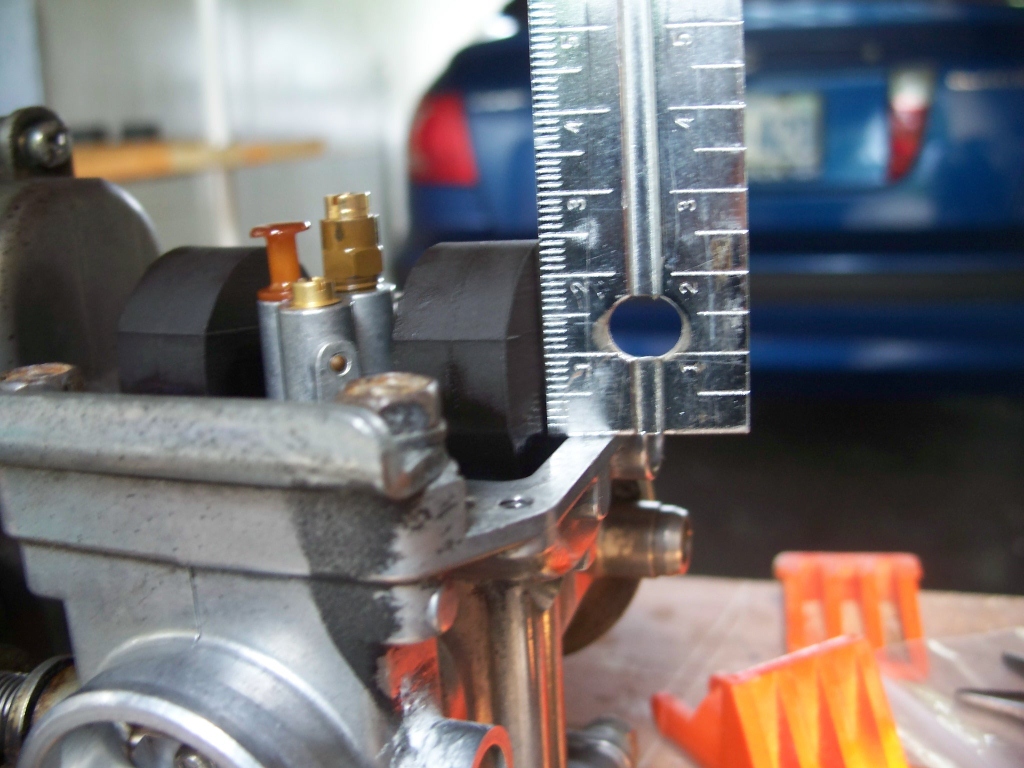 Hold the clear tube up to the carb and use a ruler to measure the fuel height. For the inside carbs holding the tube up to the #1and #4 carb body is fine as long as the carbs are level. Record the measurements