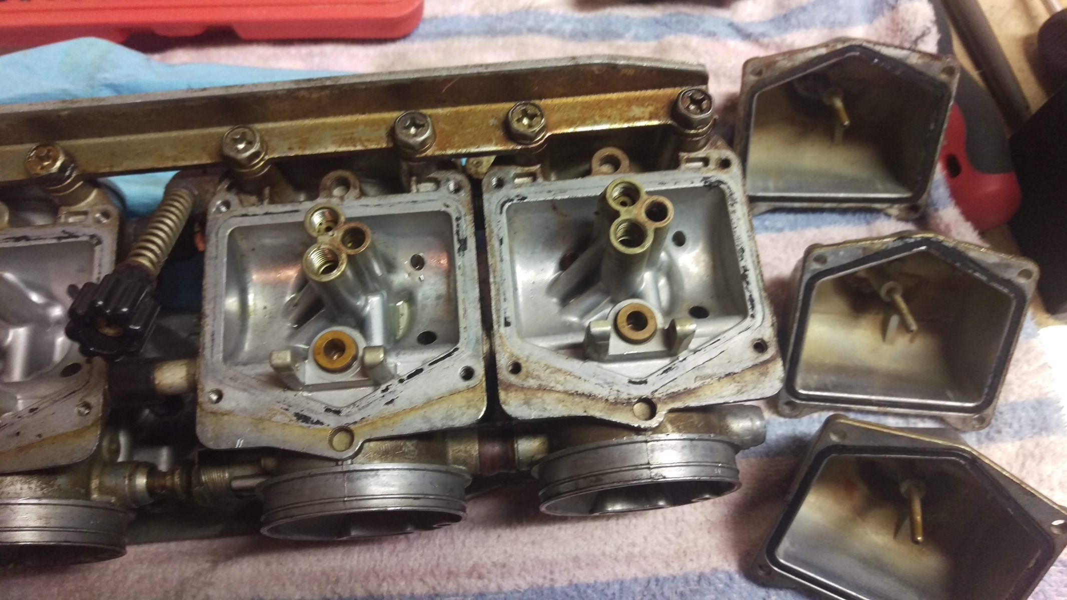 Ok so just a update last night managed to get some time in the garage and finally got everything back on the carbs and they look right only took me like 4 times of taking them apart but I got it. Was going to mount them to the rails and work on bench sync and float checks but when I pulled out the bolts I realized that I never cleaned them up so had to call it a night. Got them sitting in some cleaner and hopefully tonight get to working on the rest of it. I wanted to thank you guys again for all the help and the pictures this group is totally amazing and the number of hours I have spent going through different post. Quick question what do you guys us to help hold the bowl gasket in I have a feeling ill have to pull them again to fix levels and the first time was a major pain.