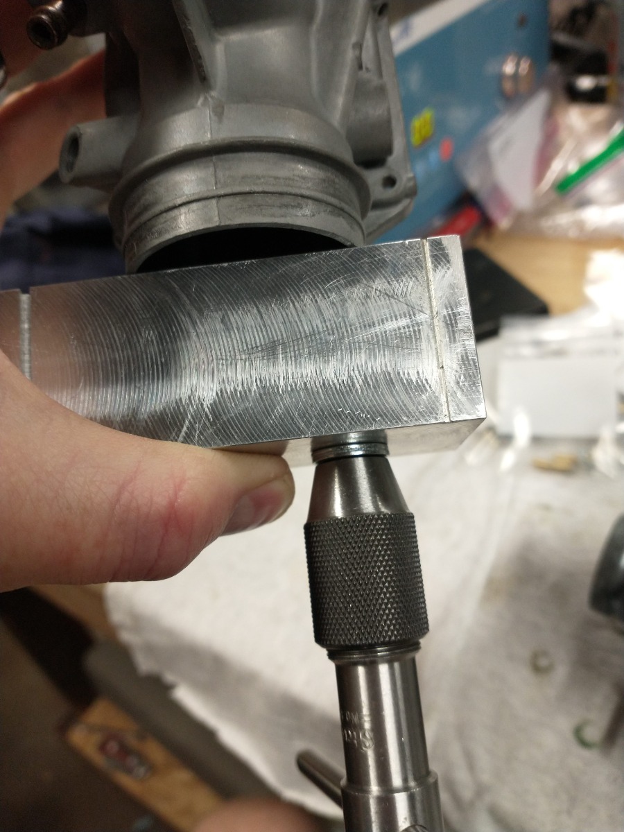 Now it is time to tap the carbs. Place the tapping block flush on the mouth of the carb. Notice how the tapping block keeps the tap perfectly perpendicular to the face of the carb body. Do not attempt this without using a tap guide, It will not be straight! Then I stacked a few washers over the tap so It would tap shallower then I needed it to go and tapped the hole until the washer and tap handle bottomed out.