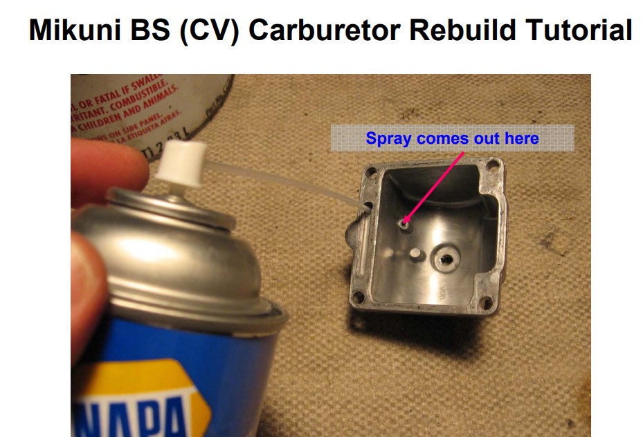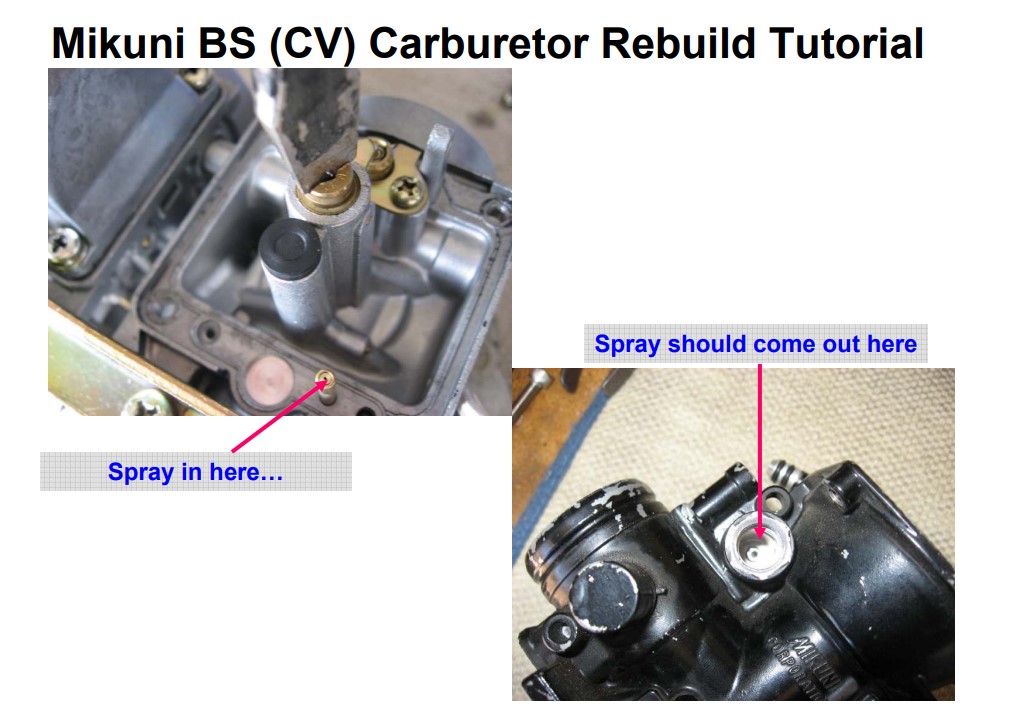 Regarding the 2nd photo, it's backwards; spray in the bottom of the choke passage, not into the choke pick up tube.