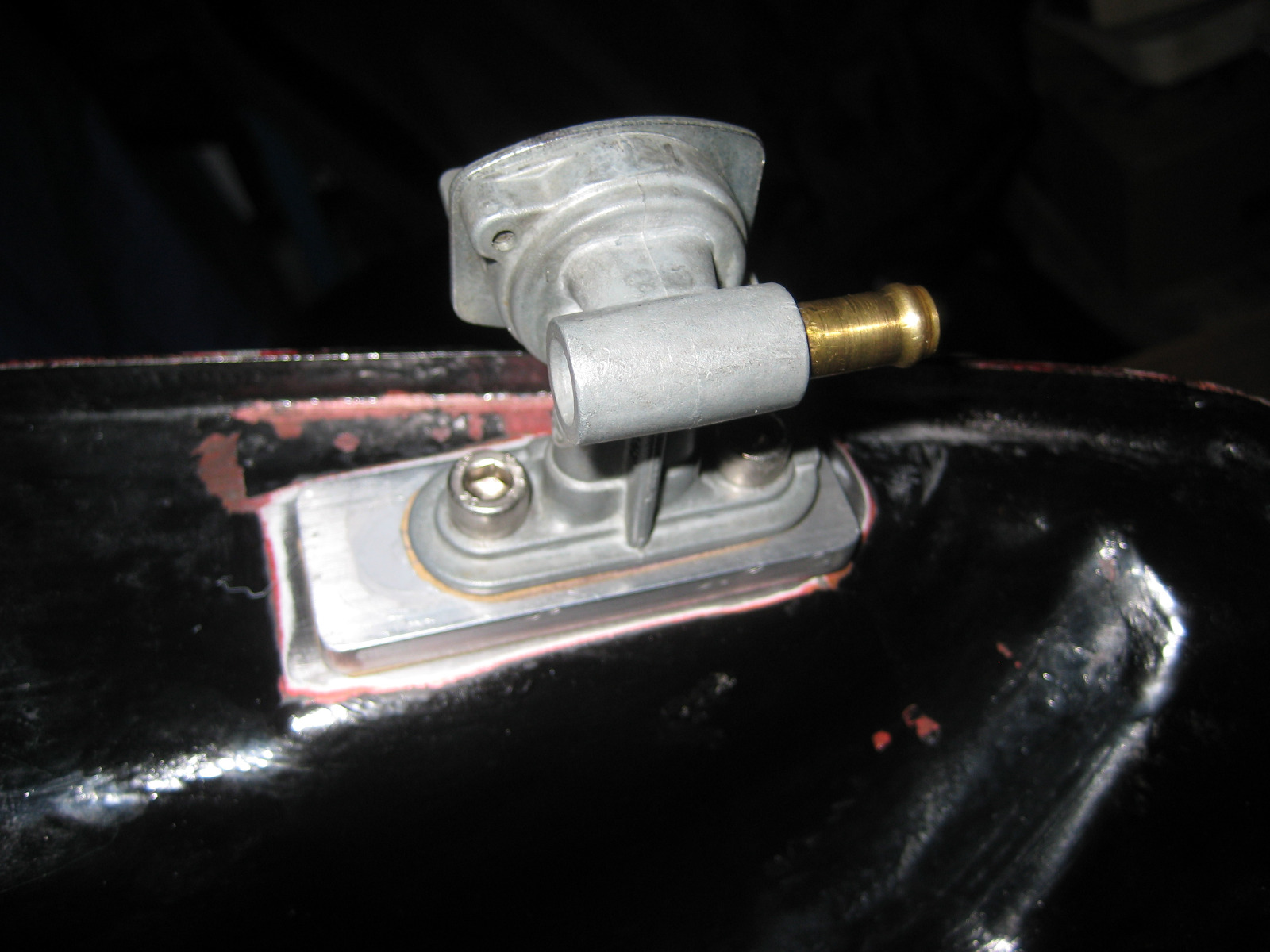 If you look at the first picture, you can see what he did. The screw to the right of the petcock is long enough to go through the petcock and the adapter plate and into the threaded bung in the tank. The screw just to the left of the petcock is much shorter and threads into the adapter plate. The screw on the far left goes only through the plate and into the bung. Its head is covered with silicone, so it is not visible in the last picture, but you can see the silicone over it.