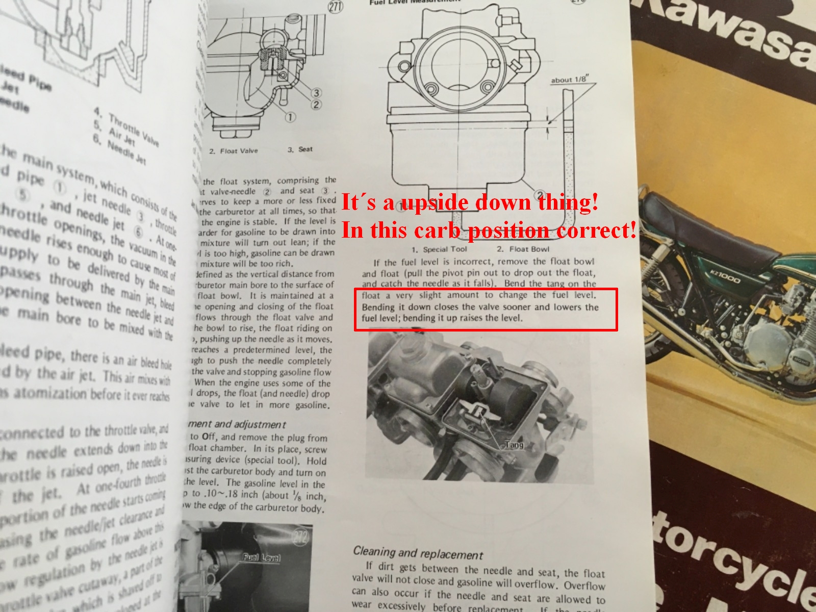 Not to sound beyond the FSM, but I never read past the Service Fuel Level spec until today. It was posted in another thread and I had never looked at the 650 FSM. Upon reading the service fuel level procedure I started to question it. The 650FSM states to bend the tang down, this closes the valve sooner lowering the level. That didn’t make sense so I pulled out other FSM’s to compare. The Kz1000 manual dated December 1977, word the same procedure as opposite, bending the tang down closes the valve later and raises the level. Which one is correct? I pulled out the Z1/Kz manual dated March 1977 and it words the procedure same as the 650 manual, with one exception, just below the paragraph is a photo of a set of carbs. They are upside down bowl up, this completely validated the 650 FSM. So, the PSA here is, regardless of carb orientation bending the tang towards the float needle closes the valve sooner and lowers the service fuel level. Vice versa, bending the tang away from the float needle keeps the valve open longer and raises the fuel level. FWIW.