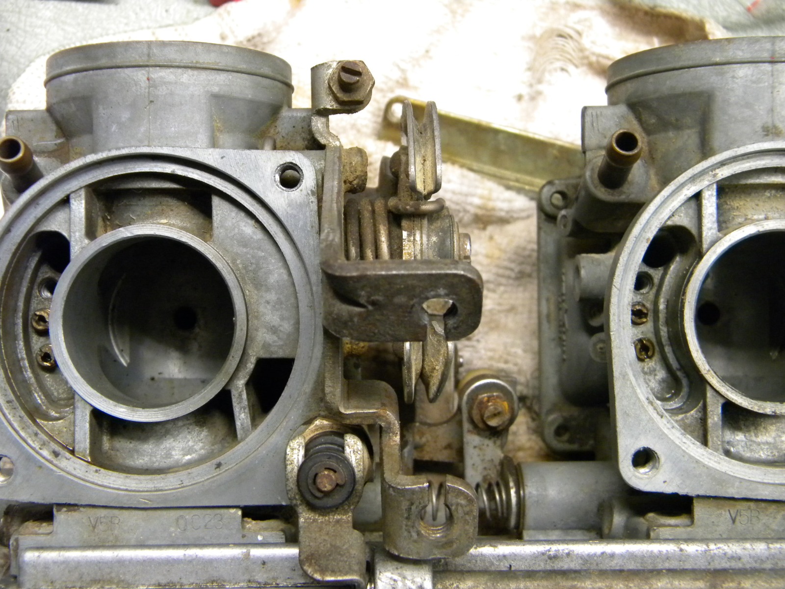 I have a couple of weird questions - the first is about the carb on my '76 KZ400S2...it's stamped "V5B", with the numbers OC23 and OC19 respectively on each side. I can't find any cross-reference for this carb. Also, the manifold boots for this year bike is allegedly 16065-037, but that number cross-references to a boot that is 5mm too narrow than the ones I took off! The throat of the manifold boot I took off measures 41mm, not 37mm. Did somebody down the road change out the original carb?? Also, the jets you can see in this carb are #40 on top and #90 below, on both sides...the diagram calls for both to be #40 in the 1976 KZ400S2 - but there IS a #90 listed for the 1976 KZ400D3...