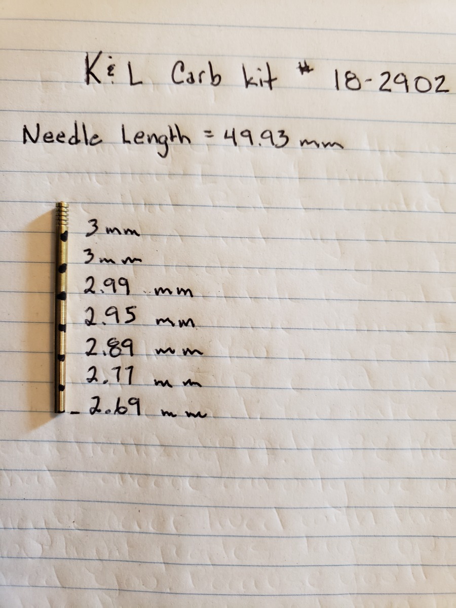 That's my understanding as well. I imagine rebuild kits just include the Canadian version with the adjustability as I haven't seen a kit with only one circlip position. Just received my K&L rebuild kits # 18-2902. Unfortunately only 3 arrived instead of 4, the 4th is MIA per seller. Can't complain I paid less than $10 ea. Measured the needle in one of the kits same way as before. There's a chance I can get the stock needles from my friend who gave me the bike. If he can find them. If so i'll measure those as well since i'm on a roll!