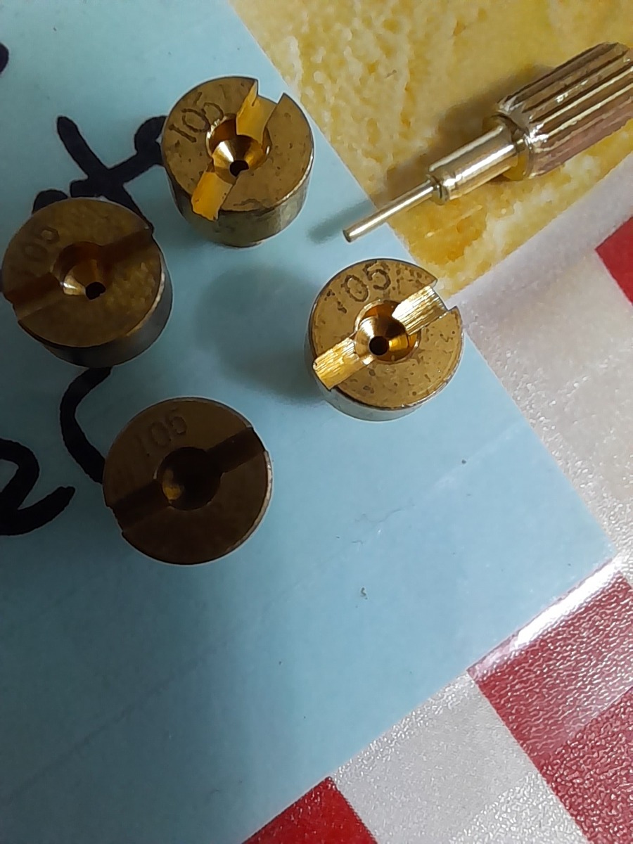 Seems the jets of dubious origin are spot 105's, I made a measuring tool, only another 4 different sizes to make now.