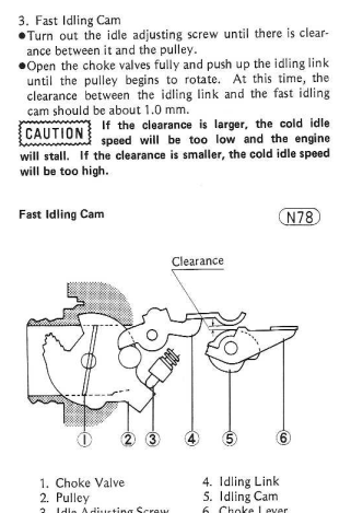 26 Jul 2023 10:14I feel your pain. The manual is very nondescript for being OEM service information, a lot of it is poorly translated and the terminology is not clear. The fast idle link clearance should be measured in the position right before it actually starts moving the throttle plates. They use "Choke plate" and "Throttle plate" interchangeably. All the fast idle link does is raise the idle when choke is fully applied to prevent stalling. The only way to really adjust it is by bending it. I wouldn't worry about it too much unless you are having idle issues. I know the one on my KZ750 is slightly over extended causing a high idle when it's fully choked (around 4k). I just modulate it with my hand to get it to 1500rpm. Are you having a problem with idle being too low?
