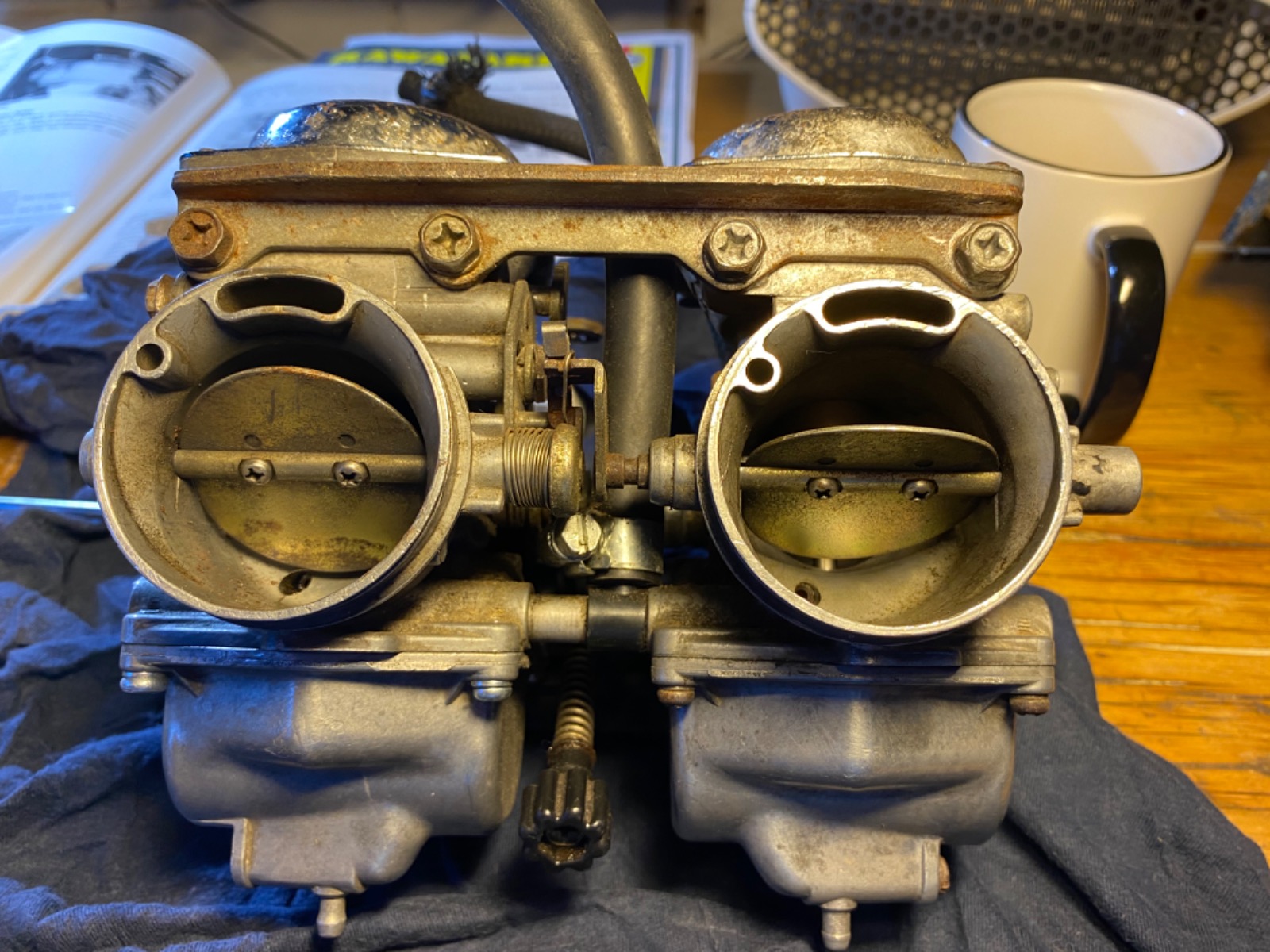 Carbs now on my workbench. I’ve noticed 2 things and I’m wondering whether I should address them before I separate the carbs: