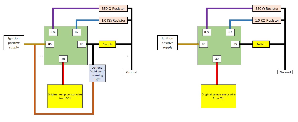 Below is the relay wiring diagram to control cold-start as discussed. Normally the 350 ohm will be in play but when the switch is activated it will move to the 1000 ohm resistor. I have included two versions, with/without optional warning light. Don't forget this is a "fix" and the underlying problem will still exist, also be careful where you locate the resistors as they may get hot (possibly not as the current flow is very small but better safe than sorry)