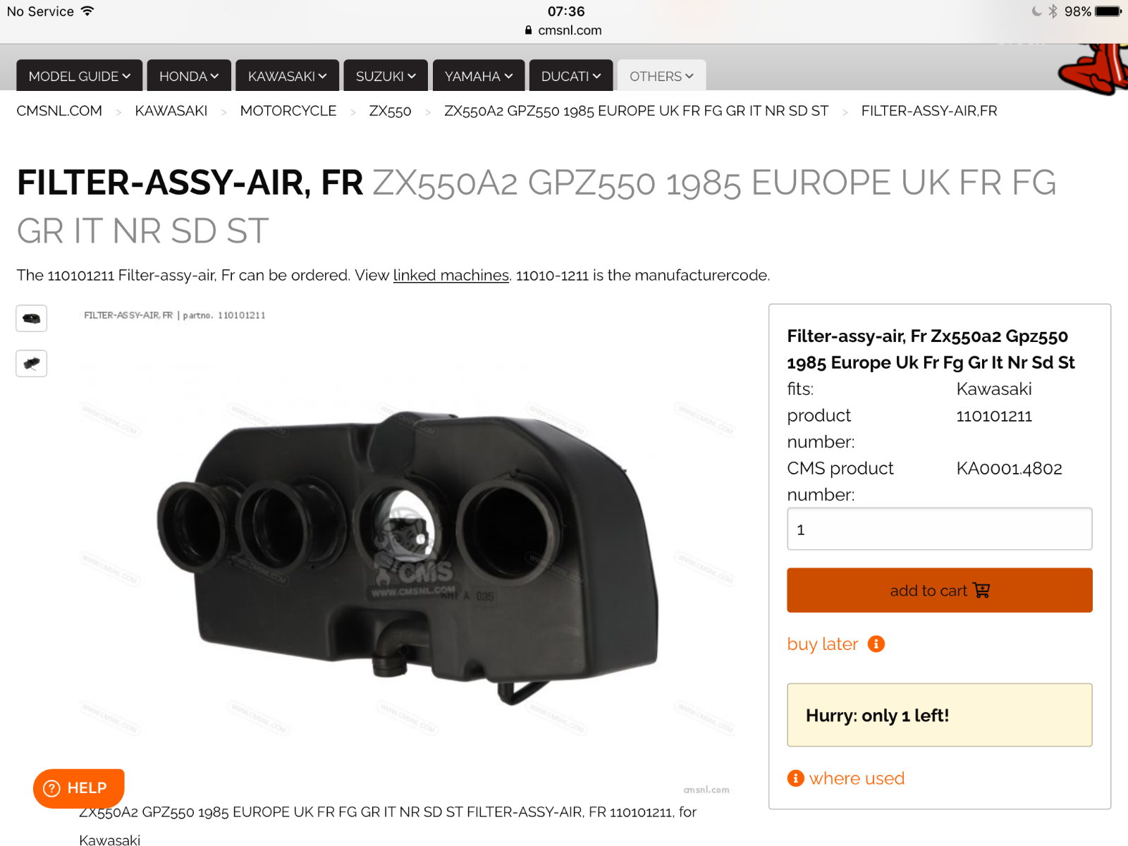 I have searched all over the internet and am yet to come a cross an air filter assembly for a 1985 gpz 550. Part #11010-1209.
