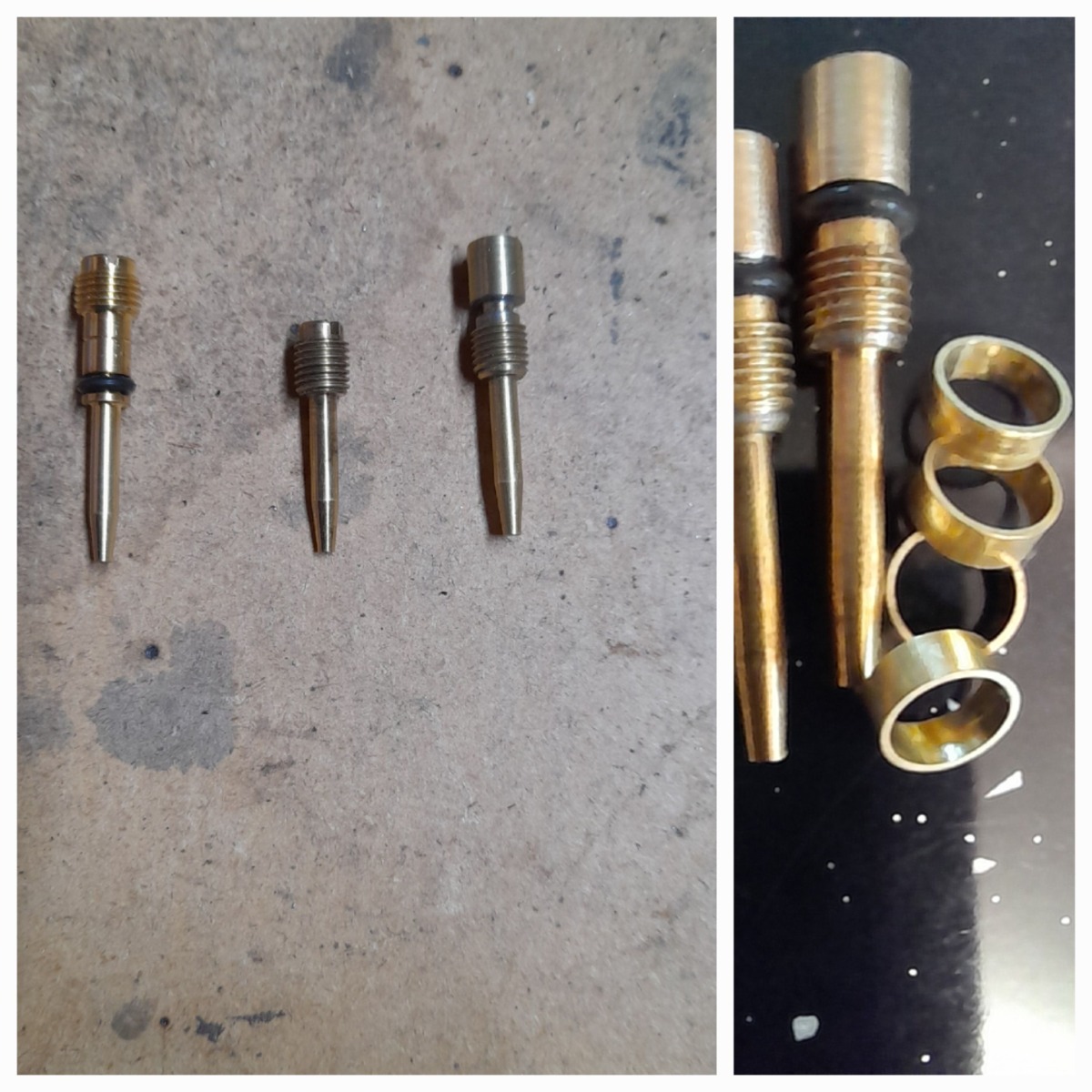 I purchased a set of US spec 28mm pumper carbs here in the UK very cheaply, they had been sitting a very long time unused, evident by zero wear on the slides and no evidence of being apart, number 4 slide would not return upon cloes inspection there was a high spot on the wall of the body, 2000 grit mesh and a couple of minutes took care of this. Tamper plugs were taken out and New genuine purchased but were a lose fit, so I made new air screws using using the type we had in the UK, I turned threaded part down down to 3.5mm leaving a small shoulder, then made the threaded part to slide on and soldered, I then cut a slot for a screwdriver, I then made brass inserts for where the tamper plug goes, adjustment now made easy.