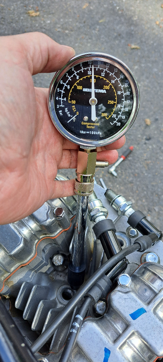 Today i did a new attemt to get the carbs syncronized. Today i had more tools .First checked if there was any airleak at the rubber boots on both sides of the carbs sprayed with starter fluid around the boots.No difference in idle speed so that was good no leaks. Then checked the compression to se if valves are okay.