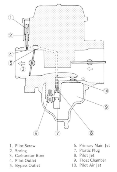 My question is this. Looking down into the pilot screw holes the two sides look different. The right side carb which seems to run fine looks like it has an insert at the bottom to accept the tip of the pilot screw. The left side does not have this feature. Is there an insert in the pilot outlet that accepts the tip of the screw? (See #4 in attached pic) Can they be lost when cleaning? Can they be replaced? Seems to me if that insert was gone more air would flow through that pilot circuit and it'd run lean.