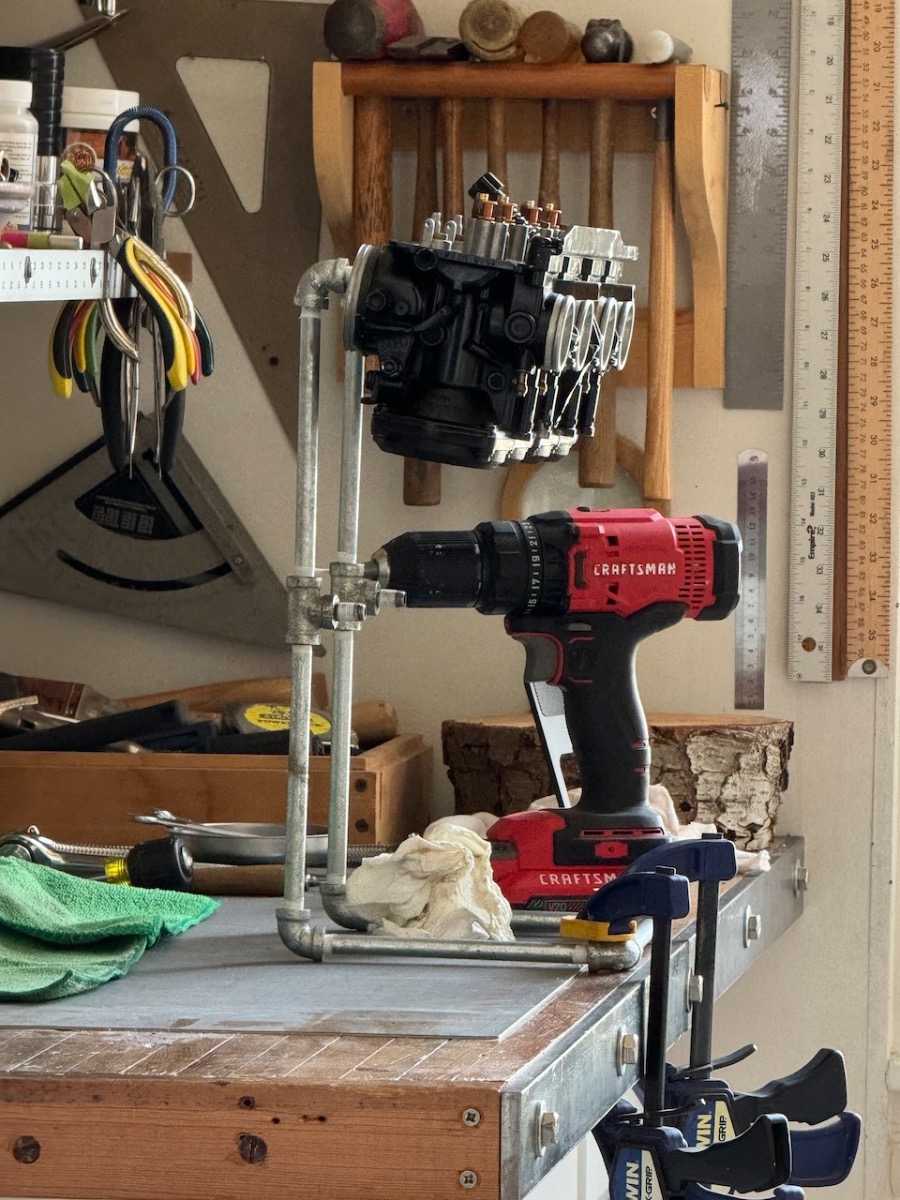 Second, I've rigged up a quick bench stand using some small pipe and fittings. It does make things easier.