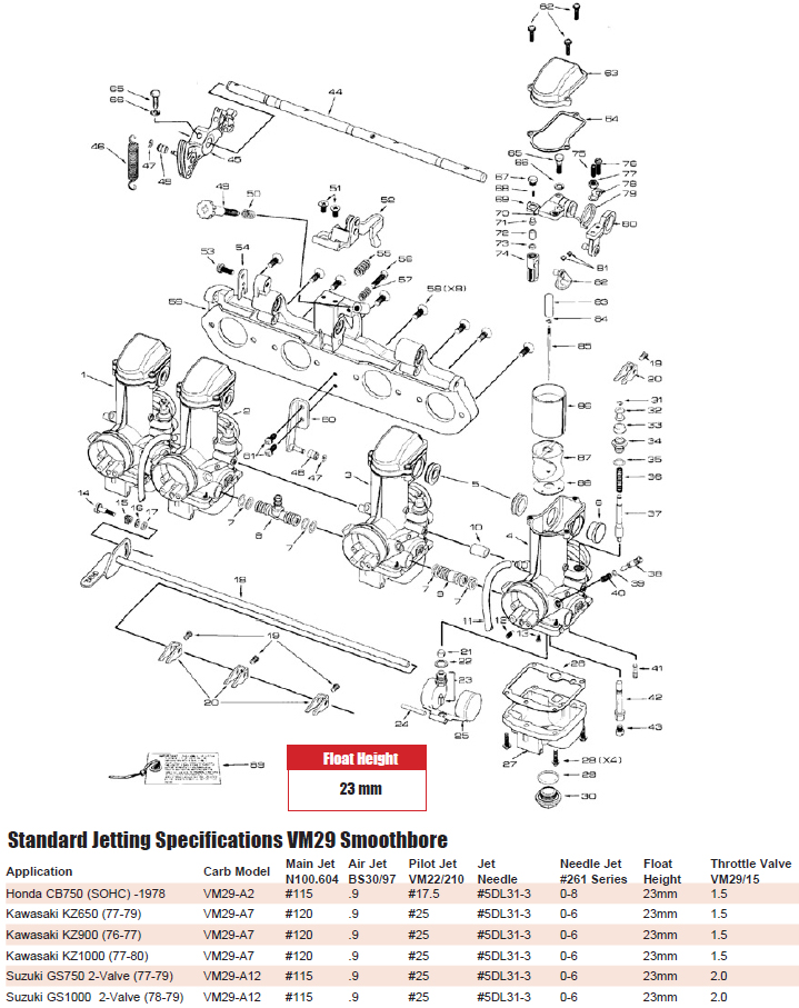 I started with a 1979 cb 750 dohc and rebuilt it from top to bottom with suzuki suspension and a bunch of custom fiberglass. With original cv carbs and air box it was alright but never consistent with throttle response and wot seem flat sometimes. I was living with it by riding nice and easy on it most of the time. I put about 16000 kms on it like this. I was always looking to do a lung transplant to be able to run pods. Finally I found some vm29 smoothbores in alright shape. ultrasonic, replaced everything except floats and enricher plungers. They seem alright. After assembly and mounting I found it running very rich @ idle. Plugs are super black. These carbs are stamped A7. I think these were from kawasaki but sudco also listed cb750 sohc but were from A4 stamping. It has all the internals as listed on sudco as they came off a cb750 dohc with the adapter spigots. I tried swapping pilots from 17.5 and up to 25. Always running rich with black plugs. After a 15 min of idle it wants to stall from fouled plugs.