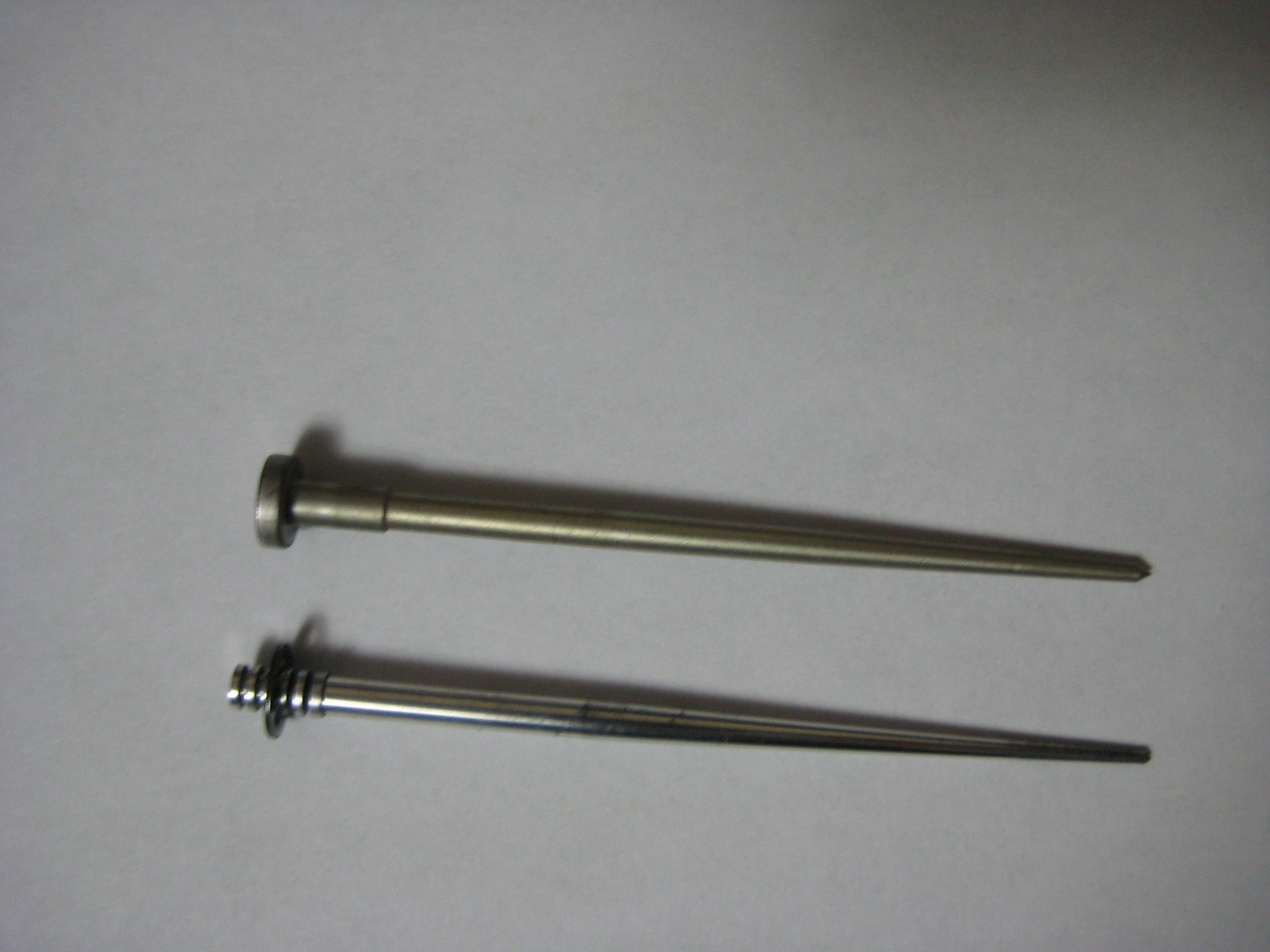 Stock needle has no adjustment but can be adjusted "leaner" by stacking washers under the heads. You can see how much thinner = richer the Dyno-Jet needle is.