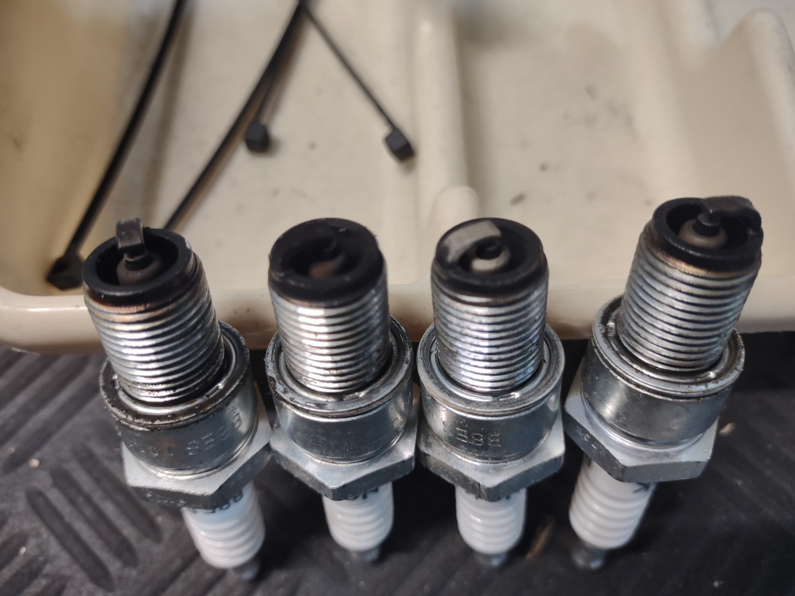 I want to thank everyone for their help. I’m trying to learn this as I go. I took the carbs apart and cleaned them using plenty of carb cleaner and an air hose, then put everything back together. Changed the jets to 120 main and 17.5 pilot fuel screw at 1 1/4 out. Bike ran great (maybe even a little stronger than before) under heavy throttle, however a little “boggy” on take off and at cruising. If I snap the throttle from idle it bogs, if I roll on the throttle it is fine. Came home and took the plugs out to see what I could. To me 1 and 4 look fine, but 2 might be a tad rich and 3 looks lean. Where did I go wrong lol. Before this all looked lean.